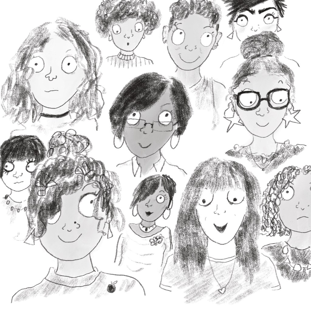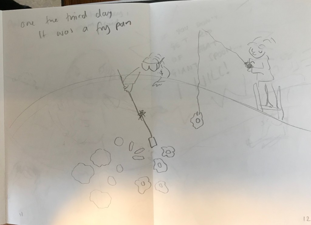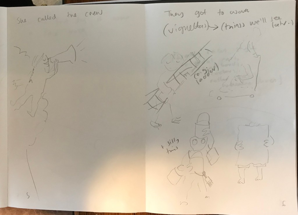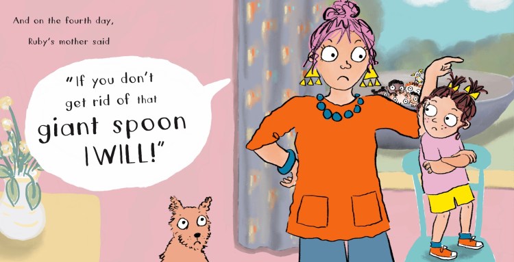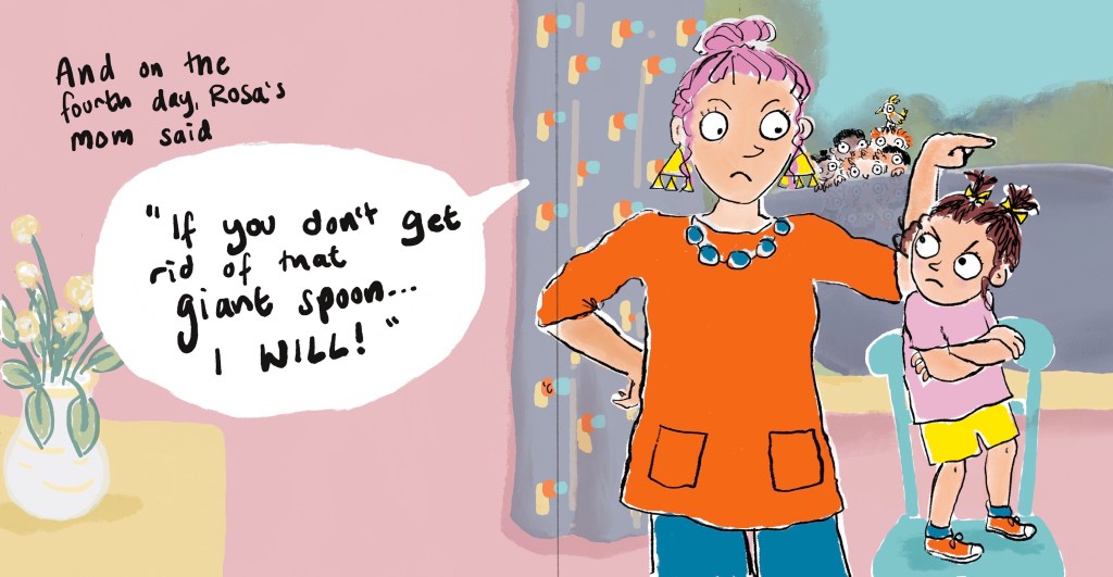 A big part of illustrating someone else’s words is having to make lots of decisions about how these characters and their world should look. A writer can avoid specifics if they choose – for example, there’s no character description in The Giant Spoon, and the current project I’m working on (to be revealed soon!) situates a family in a house, but with no description beyond a few items mentioned. As the illustrator, my job is to ‘see’ all these things. So often my starting point is drawing lots of options for what I have in my head. This brings lots of questions. How does the mum wear her hair? What’s this little boy’s favourite toy? What’s their kitchen like? I’m a character designer, wardrobe department, set designer and casting director all in one. And if these things seem trivial, think about the semiotics: if I give mum a ‘helmet hairdo’ you’ll read her very differently compared to if I gave her a scraggly tangle. If I give the boy a book, that’s suggesting a different kind of boy to one with a super soaker. Even though in real life lots of kids love their books and their super soakers… All these details get worked out through drawing.