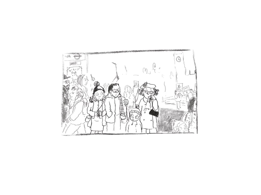 Figuring out goes hand-in-hand with working out the overall flow of the story across the pages. There’s almost always some limit in he number of images that can be used. For example, picture books need to fit a certain page range and work with the way the final book is folded and bound. If you are seeing the story as much as you’re reading it, then the visual flow and interplay between words and pictures really matters. This is equally true for grown-up storytelling (I’ve just finished working on a series of postcards for an audio production, to foster mindful listening and encourage conversations in response to the deep and sensitive topic at the heart of the story). All of this involves drawing – I usually start with layout paper or final size digital canvases, and sketch out how I see the whole thing working together.